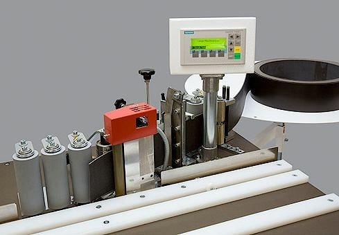 Клей расплав наносится непосредственно на наклеиваемый кромочный материал. Станок кромкооблицовочный LANGE B580K имеет вращающуюся тарелку для размещения рулона кромки. Для удаления свесов кромочного материала, образующихся после облицовывания кромки, в станке предусмотрено электропневматическое устройство обрезки кромочного материала, макс. 3 х 45 мм с приводом от концевого выключателя для автоматического замера длины заготовки.