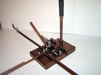 На разводной станок Тайга установлена пластина из высоколегированной стали на опорной матрице. Это предотвращает стирание металла на важных участках калеными зубьями ленточной пилы. Разводное устройство весит 15 г и имеет габаритные размеры 340х280х120 мм.