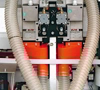 Вертикальное и горизонтальное ощупывание заготовки улучшает на кромкооблицовочном станке LANGE B 95 KF-1 точность движения фрез. Преимуществом данной фрезерной станции является наличие цифрового счетчика для ее настройки под различные виды кромки. Опилки удаляются из зоны пропила по двум вытяжным колпакам с центральным аспирационным патрубком, диаметром 100 мм.