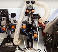 Первым вариантов комплектации станка является модификация B 95 KF-1. От базовой комплектации станка ее отличают заключительные этапы облицовки. Процесс облицовывания кромки на кромкооблицовочном станке LANGE B 95 KF-1 начинается с впрыскивания жидкости на торцевой край заготовки.