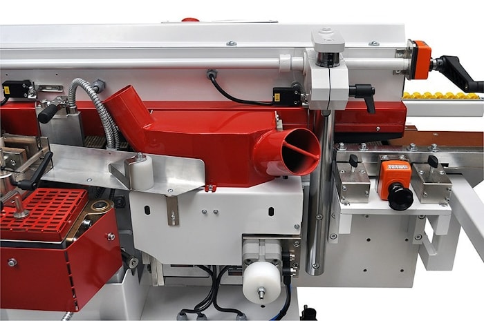 Высокочастотная фрезерная станция на кромкооблицовочном станке LANGE MB B85 KFE, работающая от двух моторов по 0,27 кВт, имеет две фрезы, которые предназначены для снятия свесов по длине под углом или прямо. Для более точного реза заготовки ощупываются вертикально и горизонтально. В зоне фрезерной станции находятся два вытяжных колпака, которые соединяются в центральный аспирационный патрубок, диаметром 120 мм для очистки станка от опилок.