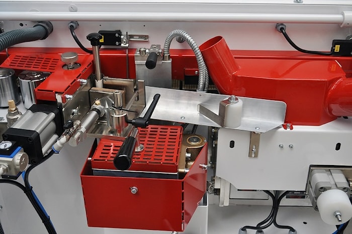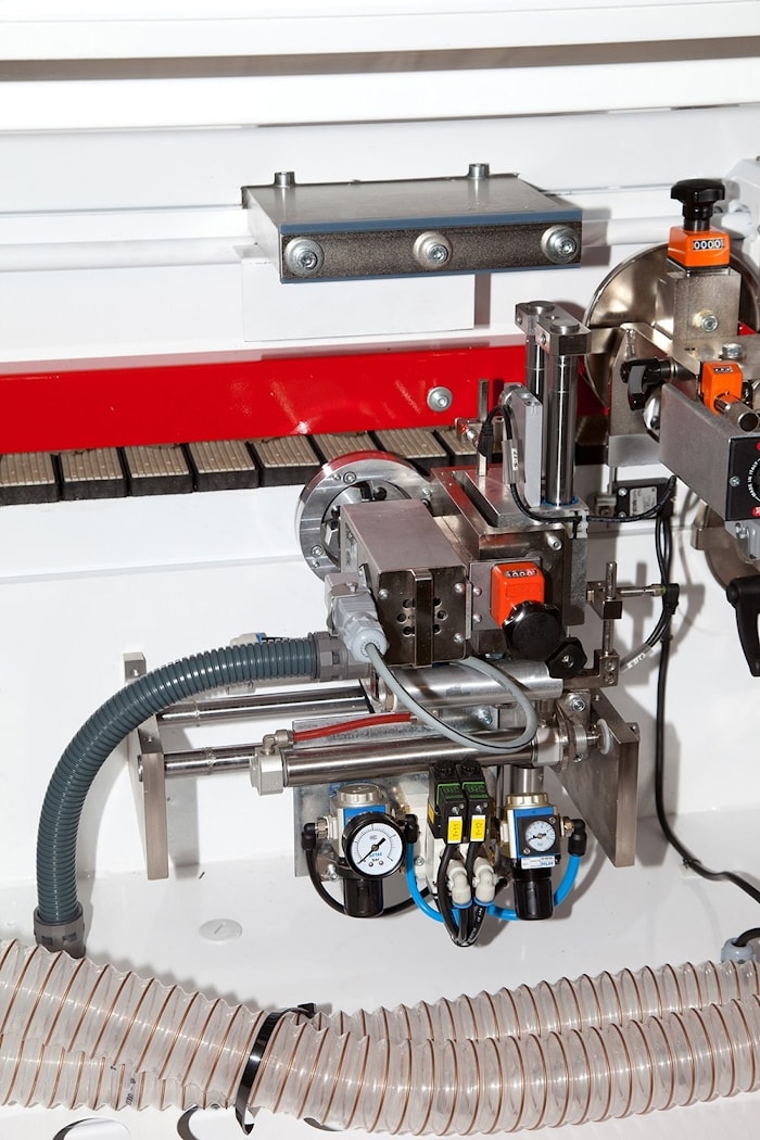 Прифуговочная станция кромкооблицовочного станка LANGE MB B85 KFE имеет две противоположно двигающиеся спиральные алмазные фрезы, которые следят за обработкой поверхности перед последующим процессом. Наклейка кромочного материала осуществляется клеевым вальцом, который наносит клей непосредственно на заготовку. Излишки клея возвращаются в клеевую ванну.