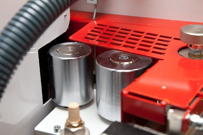 Клеевая ванна кромкооблицовочного станка LANGE MB B85 KFE имеет тефлоновое покрытие и функцию Stand-by-Function, которая заключается в снижении температуры клея при неиспользовании включенного станка. Рулонный материал располагается на вращающейся тарелке, диаметром 600 мм. Зона прижима состоит из двух роликов. Один ролик движется синхронно с клеевым вальцом, другой – имеет регулировку прижима.