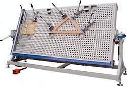 Рабочая область, состоящая из частых отверстий с расстоянием друг от друга 50 мм, позволяет разместить как небольшие, так и более крупные заготовки. Фиксируются склеиваемые элементы на прессе-вайме BORA-Dopplo при помощи прессовых балок и прижимных упоров.