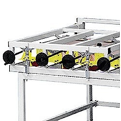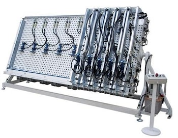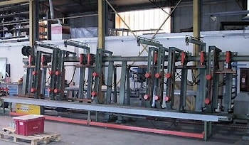 Упоры располагаются на двух откидных прижимных рамах, разделенных на секции с четырьмя прижимами на каждой с расстоянием друг от друга 350 мм. Клеильный пресс-стол TABULA может иметь по желанию заказчика различную длину и глубину прессования, поэтому при заказе пресса-стола следует выбрать одну из четырех комплектаций.