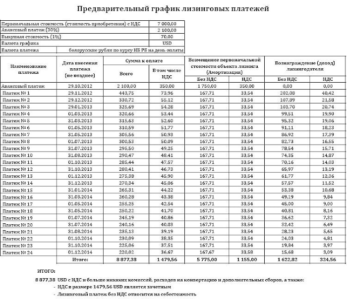 Предварительный график лизинговых платежей